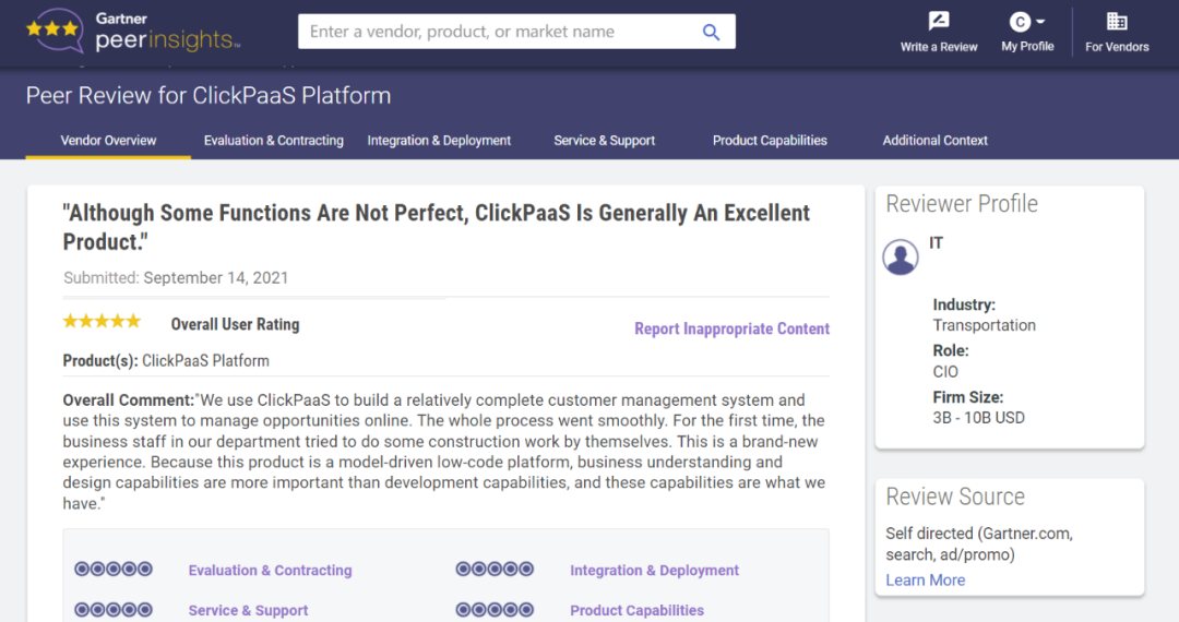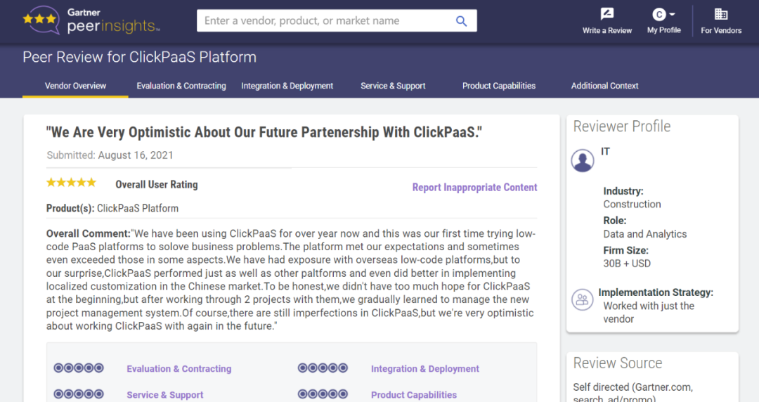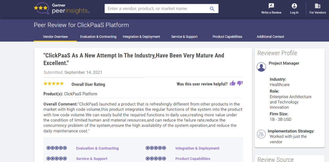 Tips::::::::::::【Peer Insights】——用户对企业IT产品和服务发布真实评价的平台。。。。。。。。目前已有355个市场,,,,,,,,,,,,,,255,000条经过验证的评价。。。。。。。。。。。。。。每一条评价Gartner会针对参评企业营收规模及参评人员信息做验证、、、、、评价内容做多维核实。。。。。。